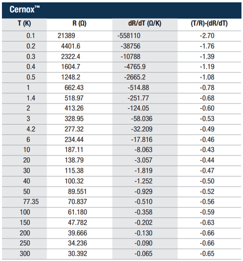 Note: In this learning example, we use a non-linear Cernox cryogenic temperature sensor with the calibration table shown below.