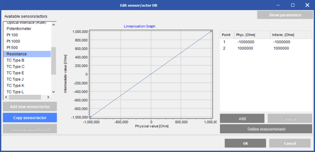 Click Hide parameters in the top right to return to the previous section, where you can add or delete the linearization points. Click Add to insert additional points. When finished, click OK.