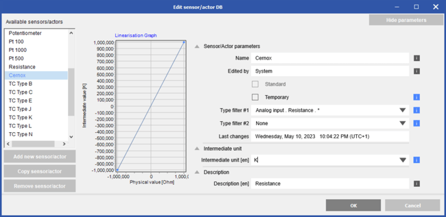 Click Show parameters. In this example, change the name to Cernox and set the unit to Kelvin (K).