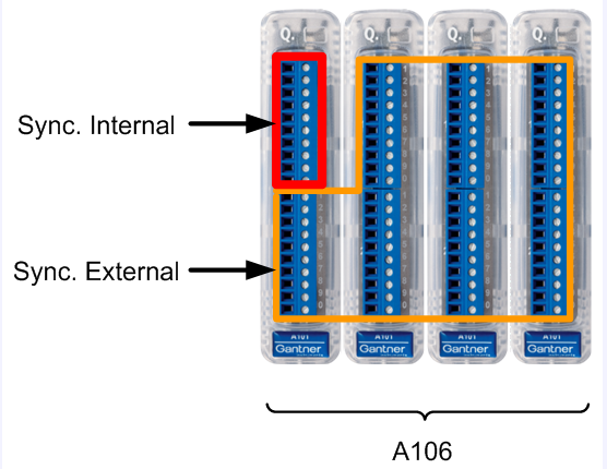 It is only allowed to set up one input as master-input on one UART. The clock for all other modules is provided via the Q.bloxx socket on the Sync lines (the master input can be on any of the connected A106 modules). All external synchronised inputs have to be configured with the same frequency as the internal synchronised (master-)input.