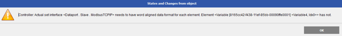 When the Modbus TCPIP protocol is activated on the dataport, the GI.bench Design Rule Check will show warnings about data formats needing to be word aligned.