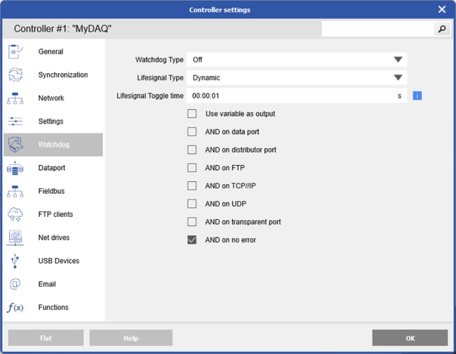 Dynamic: The watchdog (life) signal toggles between ON (high) and OFF (low). Use the “Use variable as output” function to assign the signal to a digital output or virtual variable. In dynamic mode, the selected fault conditions are combined using a logical AND.