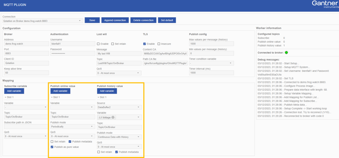 - Min values per message (history): This parameter determines the frequency of message publication based on the sample rate of the variables when using the 'publish history value' option.